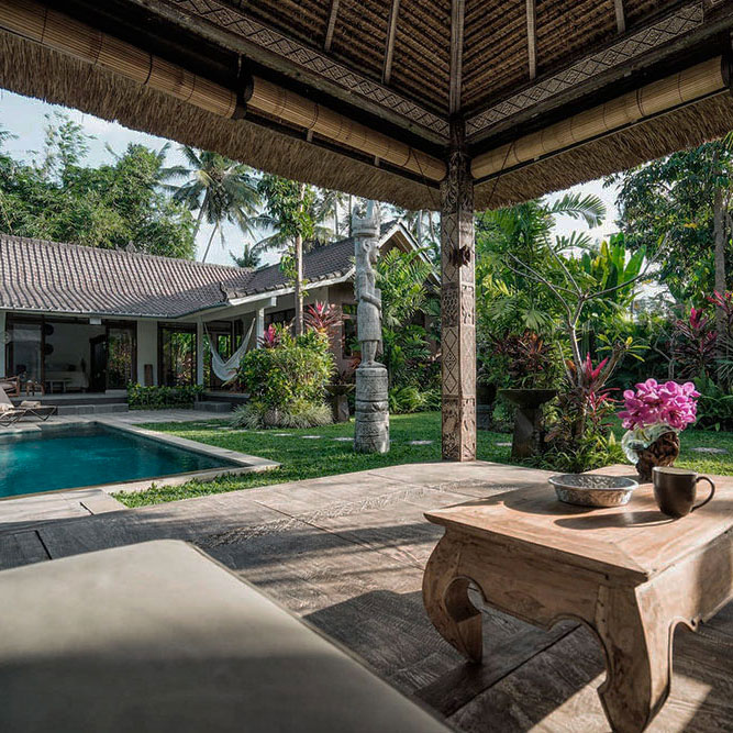 We created a chilling area submerged in the Balinese jungle. We create a traditional Sumba gazebo which was handmade curved and we add a huge and confit sofa, a small table and a soft lightening giving a sophisticated and romantic atmosphere.